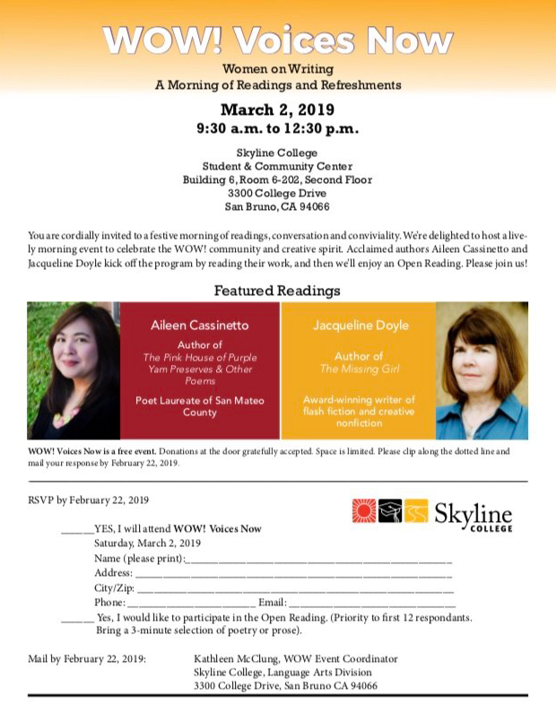 Features San Mateo County Poet Laureate Aileen Cassinetto and award-winning fiction/nonfiction writer Jacqueline Doyle.