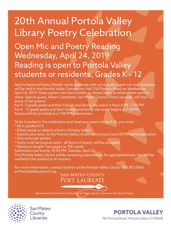 Portola Valley Library’s 20th Annual Poetry Celebration with San Mateo County Poet Laureate Aileen Cassinetto
