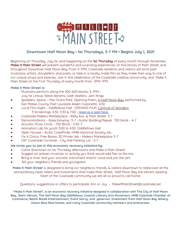 Make It Main Street is a new collaborative community event taking place in Downtown Half Moon Bay on the first Thursday of each month. The event will bring together artists, musicians, and other performers to celebrate local arts and culture and to support the businesses in downtown Half Moon Bay.