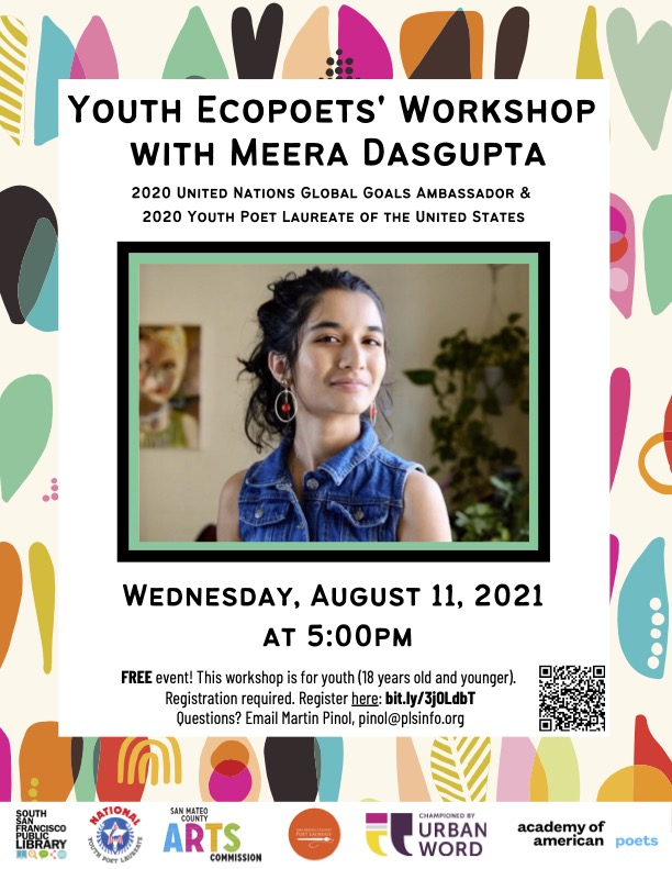 Explore poetry’s power to heal and to foster self-care. Enjoy readings by San Mateo County Poet Laureate Aileen Cassinetto, Tony Acarasiddhi Press, Roberta Gonzales-Gregg, Barbara Campitelli and Daly City Youth Poet Laureate Madeleine Hur. Share an original or favorite poem, or join in the creation of a community “word cloud.” All are welcome! Participate on Zoom at http://bit.ly/poetry-event or on Facebook Live.