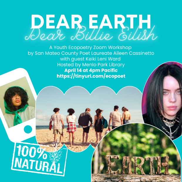 Students grades 5-12, please join us on April 14, Thursday, 4-5pm for “Dear Earth, Dear Billie Eilish”, a Youth Poetry Reading & Workshop facilitated by San Mateo County Poet Laureate Aileen Cassinetto, with guest teen poet Keiki Leni Ward, in partnership with Menlo Park Library. We’ll be exploring climate change and working on poems inspired by the songs of Billie Eilish, Childish Gambino and Alessia Cara.