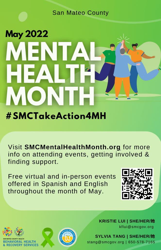 Join San Mateo County for 2022 Mental Health Month! This year’s theme, #SMCTakeAction4MH, encourages everyone to take actionable steps to address mental health and substance use matters. Check out in-person and virtual events in partnership with local agencies and community members.