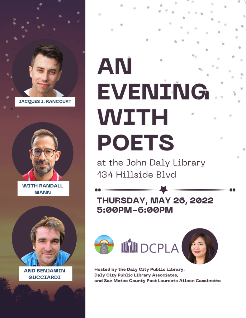 An Evening with Poets Jacques J. Rancourt, Randall Mann & Benjamin Gucciardi at the John Daly Library, 134 Hillside Blvd., Daly City, sponsored by San Mateo County Poet Laureate Aileen Cassinetto