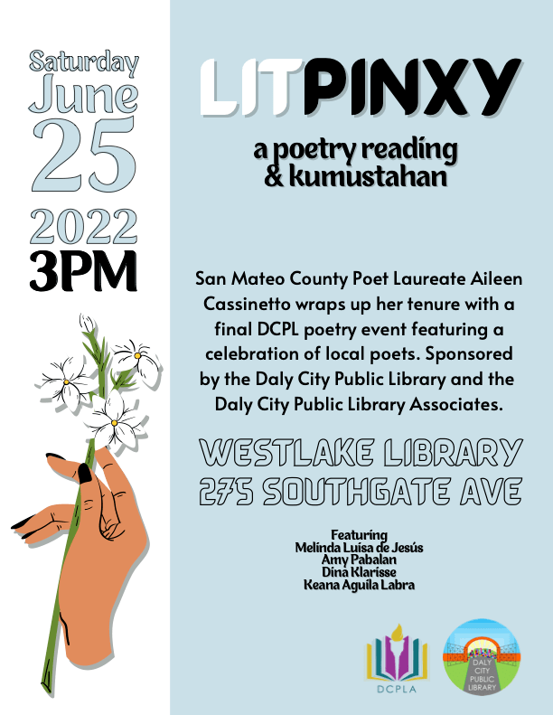 Save the date as San Mateo County Poet Laureate Aileen Cassinetto wraps up her tenure with a final DCPL poetry event featuring an all-Pinxy lineup. Sponsored by the Daly City Public Library and the Daly City Public Library Associates.