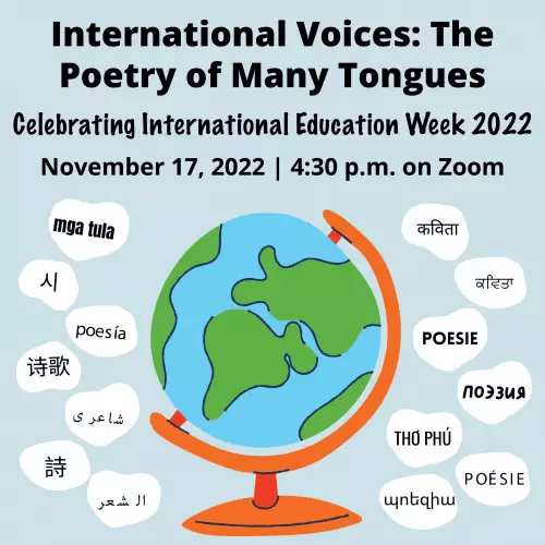 In celebration of international education week, the Skyline College Library with San Mateo County Poet Laureate Emerita Aileen Cassinetto will be hosting an poetry reading featuring poetry from different areas of the world. We will be sharing poems in a non-English language and then read a translation of it in English. Please join us!