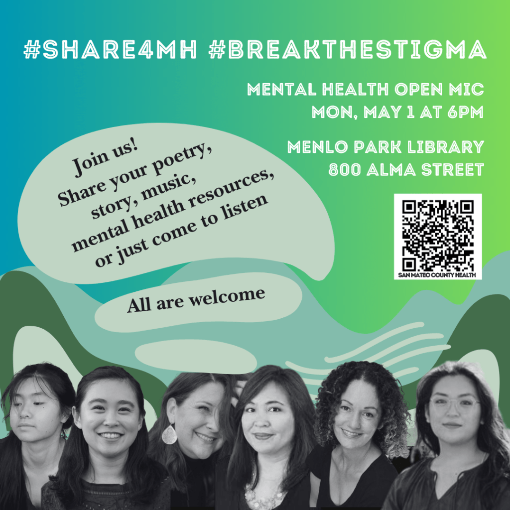 May is Mental Health Month and this year’s theme is #Share4MH. Join San Mateo County Poet Laureate Emerita Aileen Cassinetto in celebrating mental health and breaking the stigma against those with mental health issues. Share your poetry, story, music, resources, or just come to listen. All are welcome!