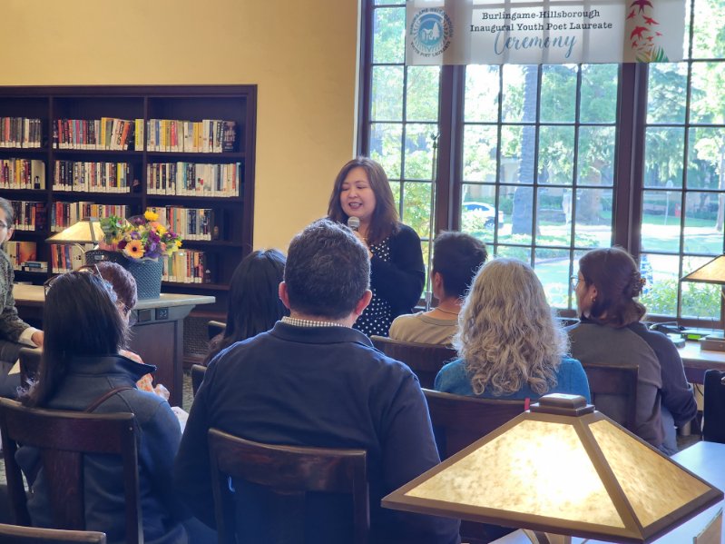 Thank you so much to Burlingame Public Library and Jenny Miner for launching the YPL program, and my friend and City Librarian Brad McCulley, Councilmembers Donna Wills Colson (Burlingame), Marie Chuang and Leslie Ragsdale (Hillsborough), San Mateo County Office of Arts and Culture Executive Director Robin Rodricks, and the San Mateo County Commission on the Status of Women for their support of our youth. Lastly, congratulations to all the finalists, gifted poets and young leaders, who showed up for every workshop, and who are everyday making a difference in our community fabric and narrative.