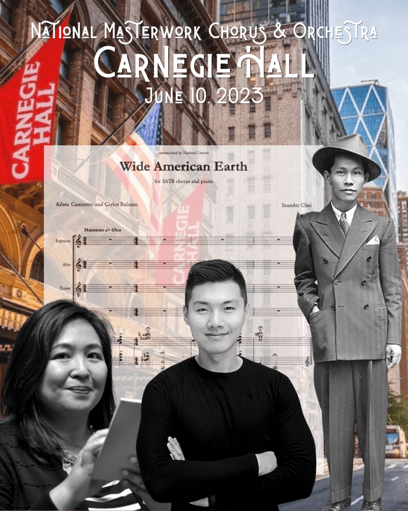 Filipino immigrant stories along with other Asian and Pacific Islander legacies will be celebrated through song at Carnegie Hall on June 10, 2023 at 8:00 p.m. Produced by National Concerts, this historic collaboration by API composers, choral ensembles, community elders, culture bearers, and cultural practitioners is centered on the world premiere of “Wide American Earth” by award-winning Filipino composer Saunder Choi. Based on poems by Aileen Cassinetto and Carlos Bulosan, Choi’s commissioned piece brings to the fore issues surrounding belonging and inclusion in the expansive, multitudinal space that is America. “I first came across Carlos Bulosan’s works while researching Filipino-American narratives,” says Choi. “Bulosan paints a rich imagery of what this yearning was like in the middle of the 20th century, while Aileen Cassinetto, a contemporary Filipino-American poet, offers a present-day perspective of the ambition and longing held deep in the hearts of immigrants.”