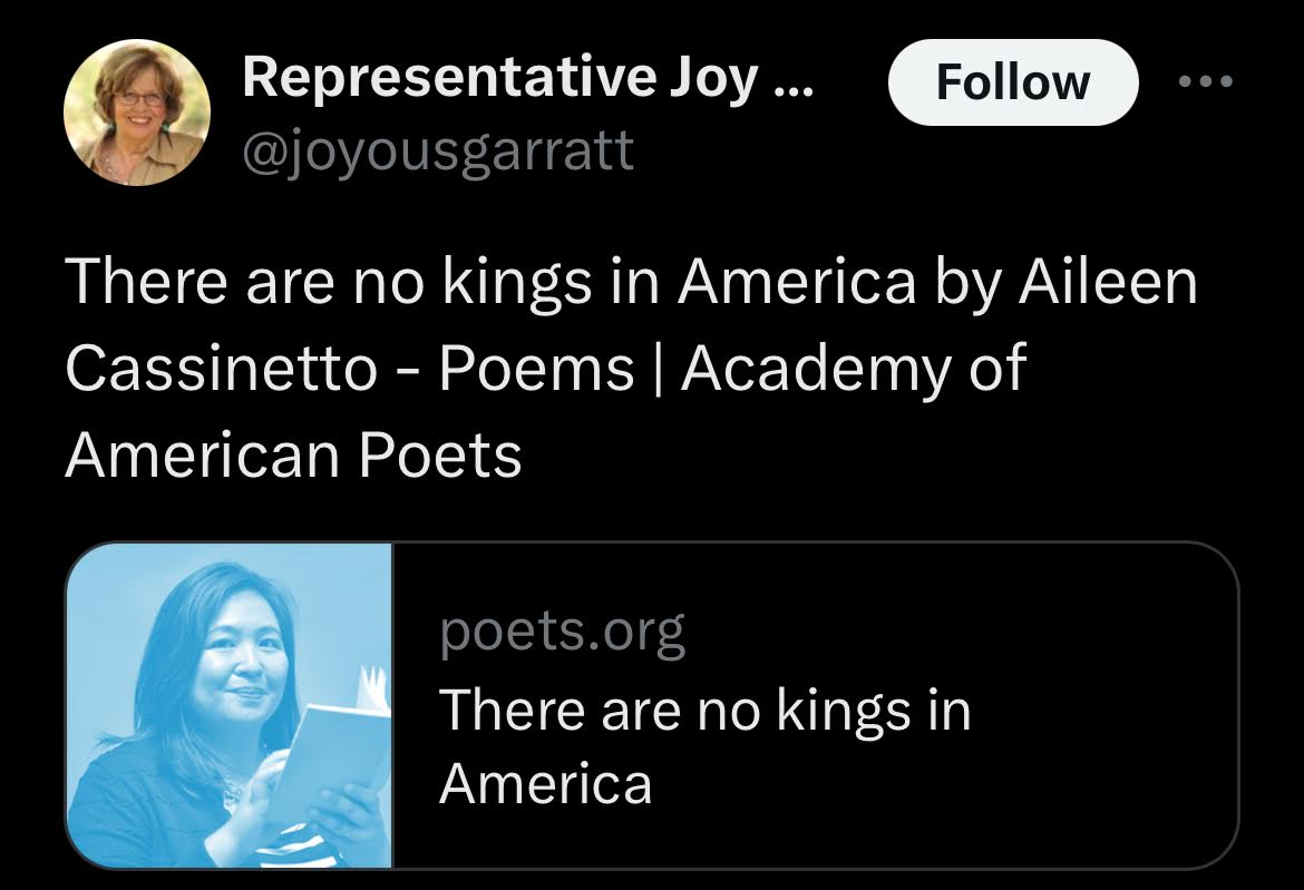 On April 19, 2025, it was featured in a printmaking exhibition as part of the 250th anniversary of the American Revolution in Concord, Massachusetts. In October, the National Endowment for the Arts made significant changes to the Poetry Out Loud program removing many works from the roster including “There are no kings in America.” That same month, Will Nixon photographed a woman at a protest in New York wearing the poem on her cape.