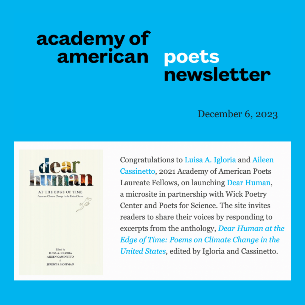 Co-sponsored by the U.S. Global Research Program, featuring readings by Jane Hirshfield, Aileen Cassinetto & Jeremy S. Hoffman, Art x Climate artworks, and the Dear Human interactive microsite in partnership with Wick Poetry Center/Poets for Science.
