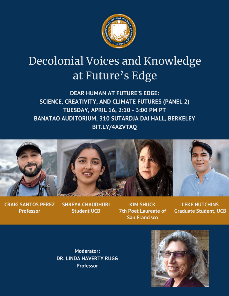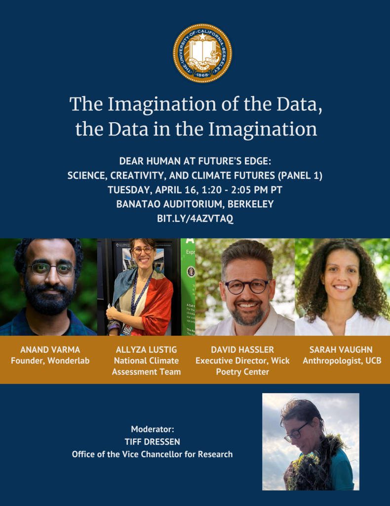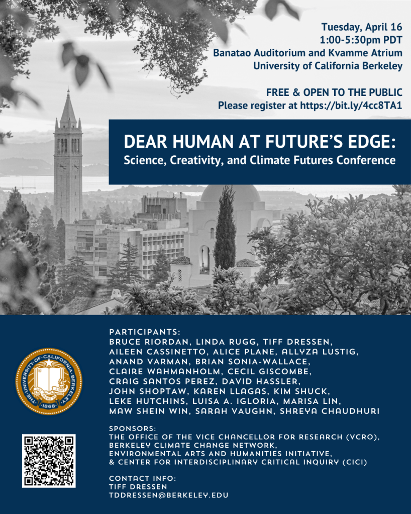 Free & open to the public. Lunch at noon & reception at 4:30pm. Sponsored by the Office of the Vice Chancellor for Research, Environmental Arts and Humanities Initiative, Center for Interdisciplinary Critical Inquiry, and Berkeley Climate Change Network.