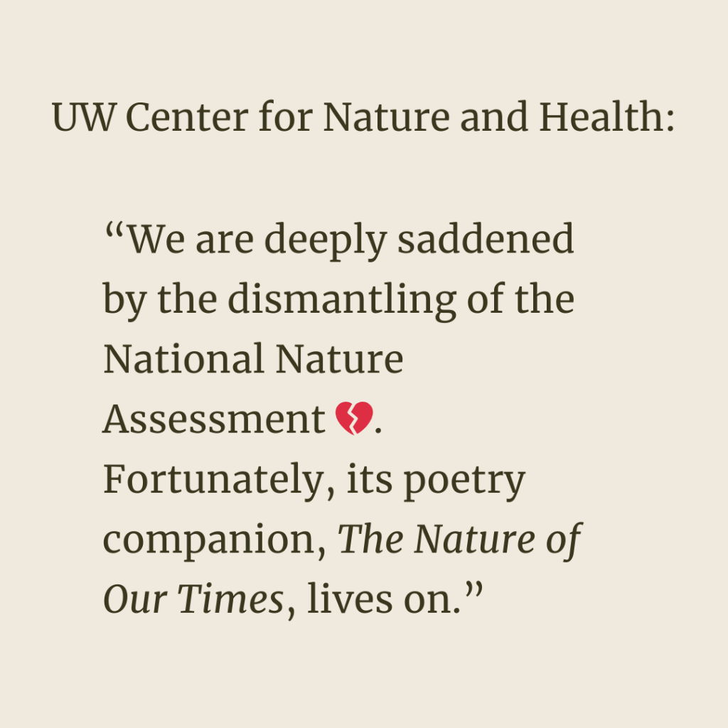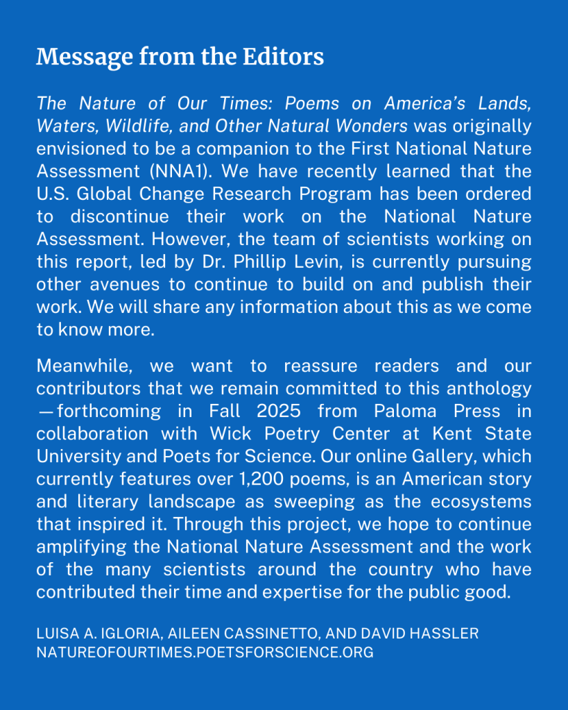 Meanwhile, we want to reassure readers and our contributors that we remain committed to this anthology—forthcoming in Fall 2025 from Paloma Press in collaboration with Wick Poetry Center at Kent State University and Poets for Science. Our online Gallery, which currently features over 1,200 poems, is an American story and literary landscape as sweeping as the ecosystems that inspired it. Through this project, we hope to continue amplifying the National Nature Assessment and the work of the many scientists around the country who have contributed their time and expertise for the public good.