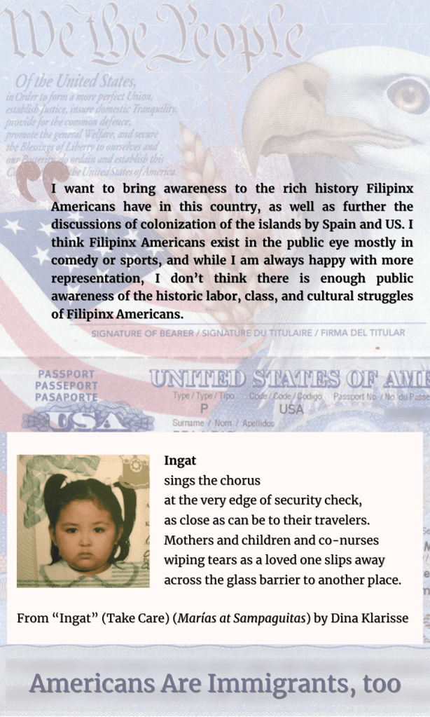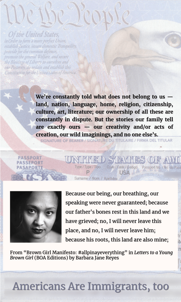 Credits to the publications in which the poem excerpts and quotes first appeared: Lee & Low Books (Argueta); West Trestle Review & Vibal Publishing House (Cassinetto); Marías at Sampaguitas (Juan); BOA Editions & Marías at Sampaguitas (Reyes); Moria Books/Locofo Chaps & Black Radish Books (Tabios)