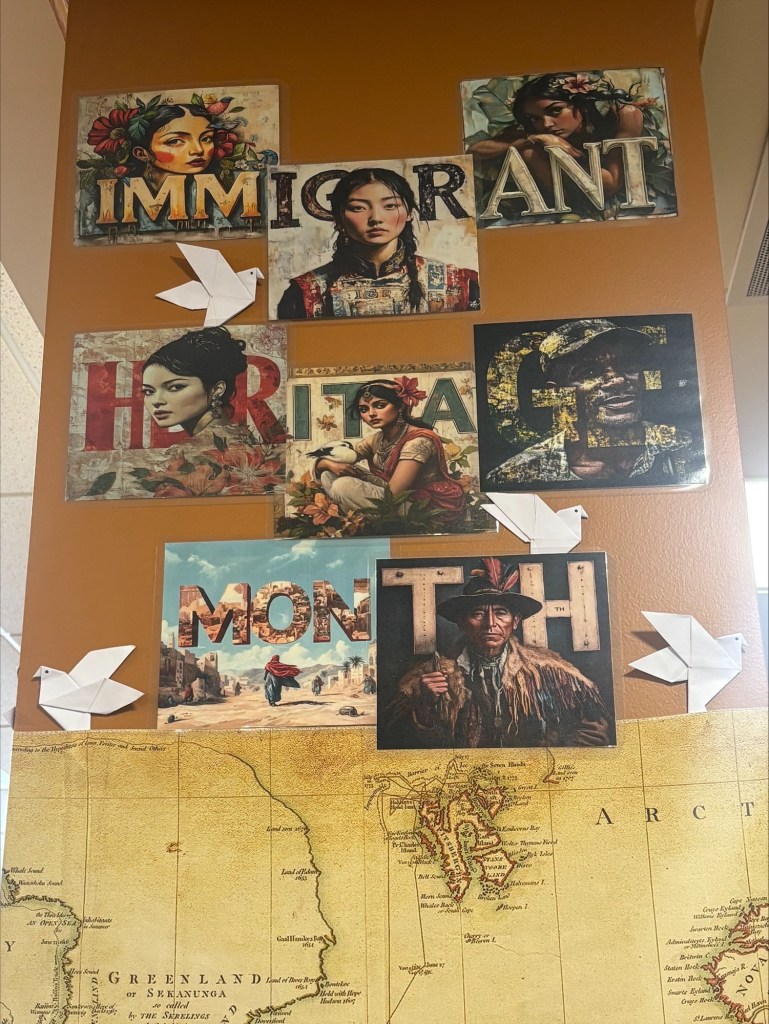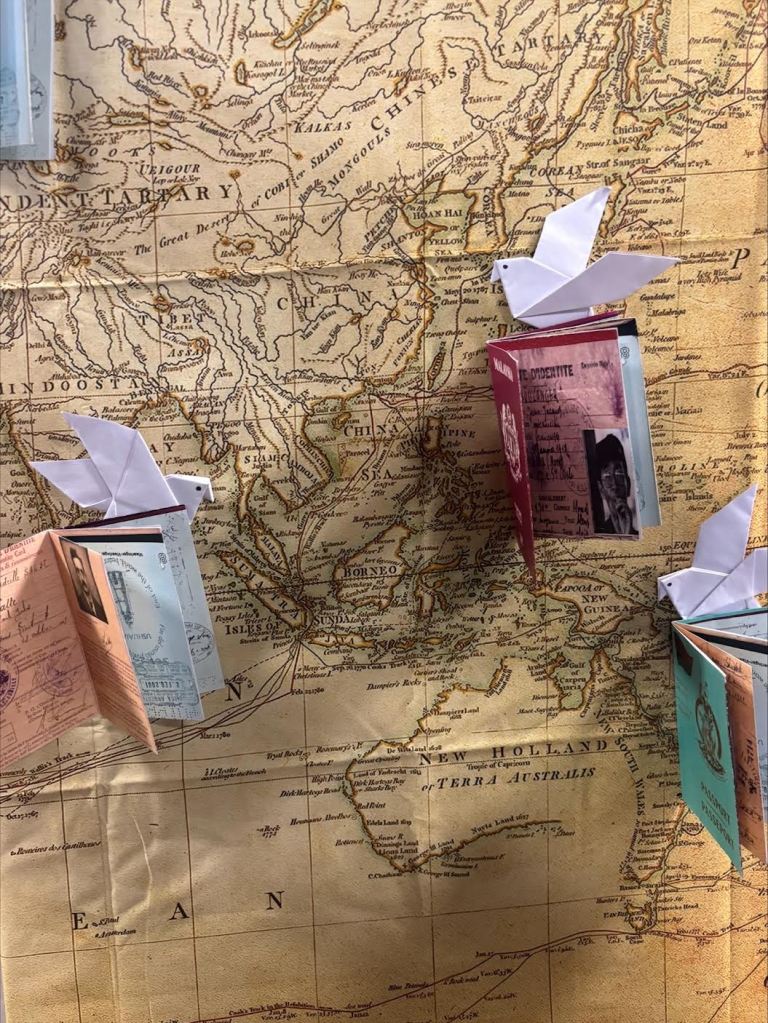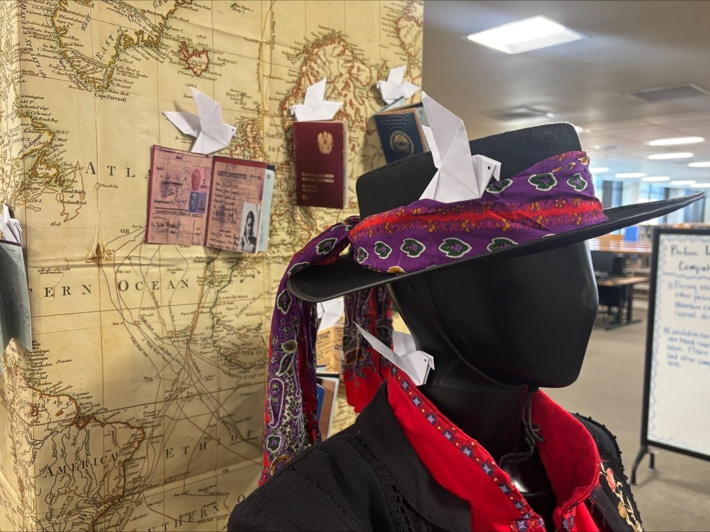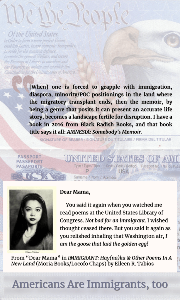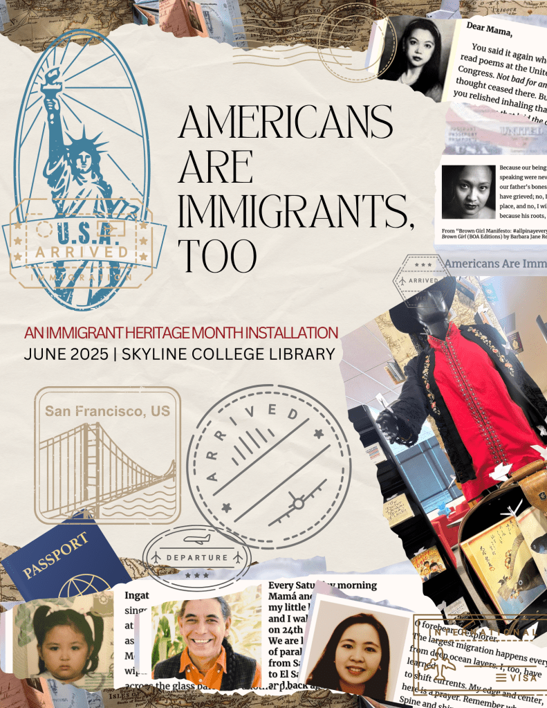 I’ve been organizing Immigrant Heritage Month events for many years, but this one feels especially meaningful as part of my ongoing collaboration with Skyline College Library. My gratitude to Saul Milan and the library for their installation portraying the movements, struggles, and freedoms woven into migration stories. It includes miniature handmade passports pinned over an old world map, paper cranes representing immigrant hopes and transformations, a symbolic figure with an outstretched arm reaching toward a new future while inviting convergences into shared spaces, a curated selection of book titles in different languages exploring migrations and border constructs, and the digital collage series, “Americans Are Immigrants, too” featuring Jorge Argueta, Dina Klarisse Juan, Barbara Jane Reyes, Eileen R. Tabios, and me, with our portraits and words overlaid on U.S. passports. The display will be on view through the end of the month.