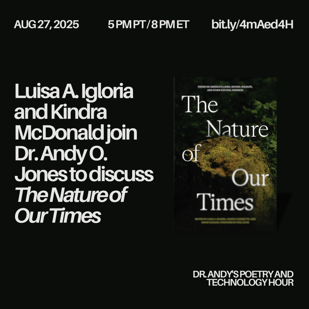 Wednesday 27 Aug at 8:00 PM Eastern Time / 5:00 PM Pacific, poets Luisa A. Igloria and Kindra McDonald will be guests on “Dr. Andy’s Poetry and Technology Hour” to discuss The Nature of Our Times. Please tune in!