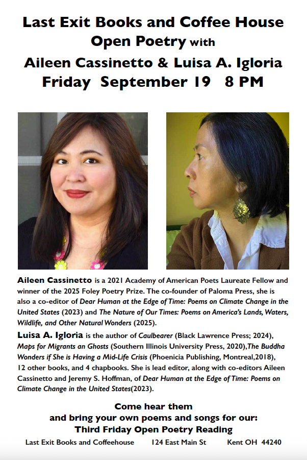 The Nature of Our Times Book Launch, Reading, Panel, and Exhibit Opening, Thursday, Sept 18, 7pm ET, at Kent State University Ballroom Balcony, and Friday, Sept 19, 3pm ET, at Cleveland Public Library.