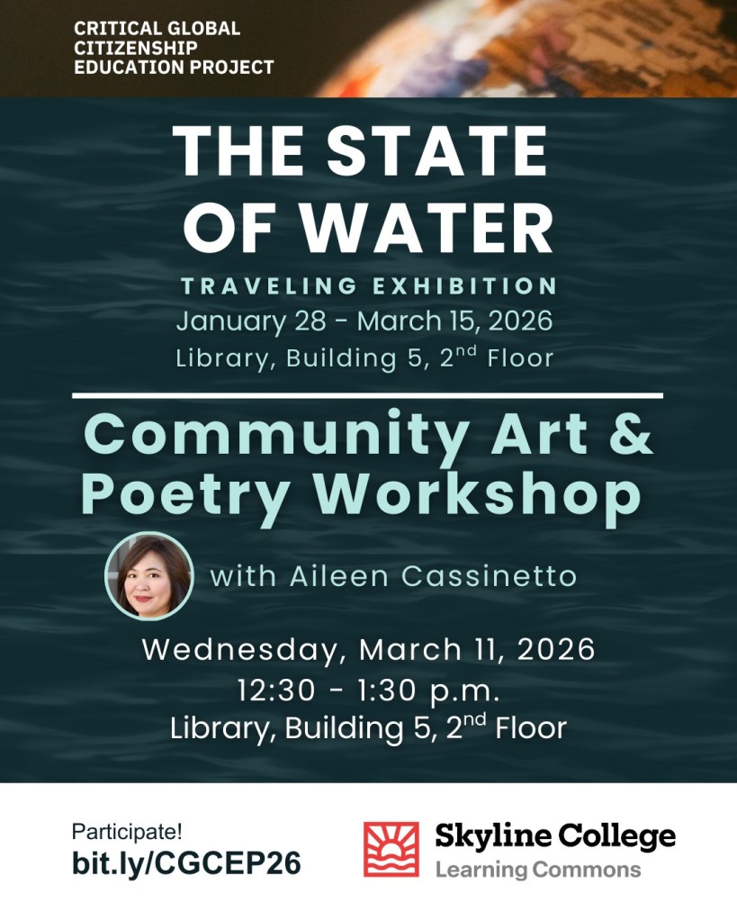 This workshop is offered in connection with Skyline College’s “The State of Water” exhibit, part of the Critical Global Citizenship Education project. In addition to the workshop, there will be a panel discussion on March 5th from 12:30 p.m.-1:30 p.m. in the library with representatives from the Association of Ramaytush Ohlone and Bay Area Water Supply and Conservation Agency, as well as Willa Brock, Director of Collections & Interpretation at Filoli and curator of its “Blue Gold: The Power & Privilege of Water” exhibit.